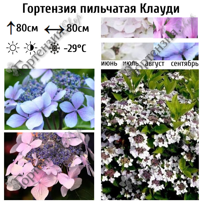 Гортензия пильчатая Клауди (Hydrangea serrata 'Cloudi') высотой до 80см, цветет интересными по строению соцветиями. Крупные бесплодные цветки своеобразной юбочкой окружают центральные плодущие. Цвет пастельно-синий, либо пудрово-розовые в зависимости от кислотности почвы. Листопадный кустарник имеет шарообразную крону диаметром до 80 см. На жестких цветоносах расцветают зонтичные соцветия. Древовидные побеги густо облиственны остроконечными, продолговато-овальными листьями с гофрированной поверхностью и пильчатыми краями. Гортензия Cloudi хорошо цветет в местах любой степени освещенности с почвой обильно увлажненной, дренированной и питательной.