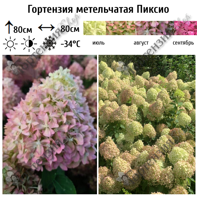 Гортензия метельчатая Пиксио - цветущий кустарник. Высота и ширина куста 80 см. Листья зеленые, побеги крепкие, прямые. Цветет с июля по сентябрь. Меняют цвет с белого/лаймово-зеленого на зеленый, а затем на розовый. Цветет на побегах этого года. Почва должна быть кислая, влажная, но без застоя воды. Зимостойкость -34 С. Используется для миксбордеров, живых изгородей,контейнерное выращивание.