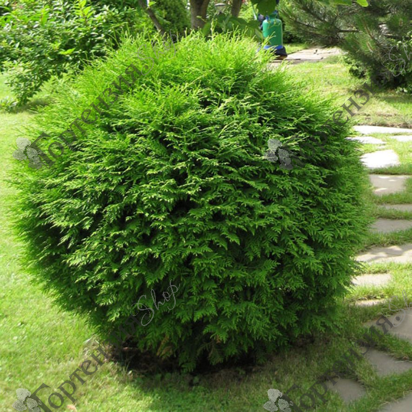 Туя западная `Вудварди`, Thuja occidentalis `Woodwardii` - шаровидный кустарник с плотной кроной. Взрослое растение достигает в высоту 1,5 м, в диаметре 1,5-2 м. Растет быстро - ежегодный прирост  до 10 см. По мере роста ветви туи больше раздвигаются в стороны и крона приобретает яйцевидную овальную форму. Хвоя чешуйчатая, насыщенного зеленого оттенка, к зиме слегка рыжеет. Хорошо переносит обрезку, и чем чаще она производится, тем гуще и пышнее становится крона.Почва: свежие, увлажненные, плодородные суглинистые.Для посадки следует выбирать солнечные участки или полутень.