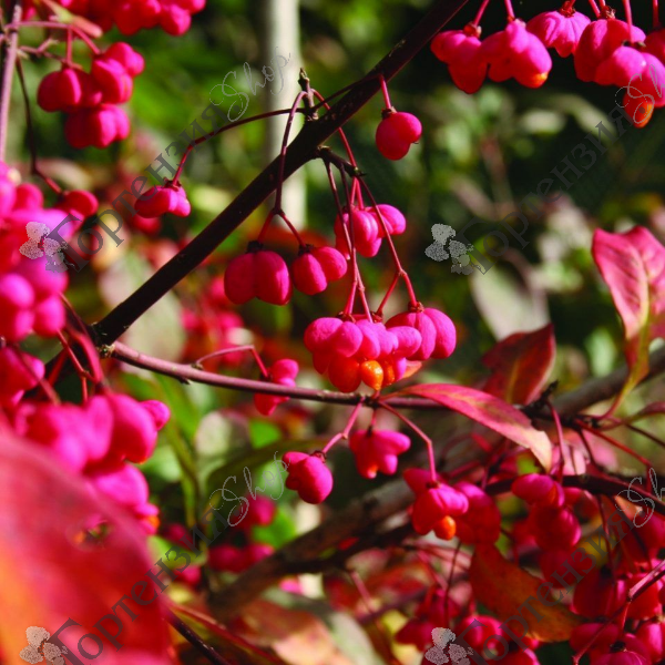 Бересклет европейский Ред Каскад (Euonymus europaeus) - листопадный кустарник высотой 3-4 метра с прямостоячими побегами. Бересклет приобрёл популярность благодаря высокой декоративности листьев, которые имеют достаточно крупные размеры, кожистую структуру и тёмно-зелёный окрас. В осеннее время зелёная масса приобретает удивительно красивые оттенки красного. После опадания всей листвы осенью на кустарнике появляются очень красивые, эффектные плоды — небольшие тёмно-красные коробочки кожистой структуры, которые держатся до наступления заморозков.