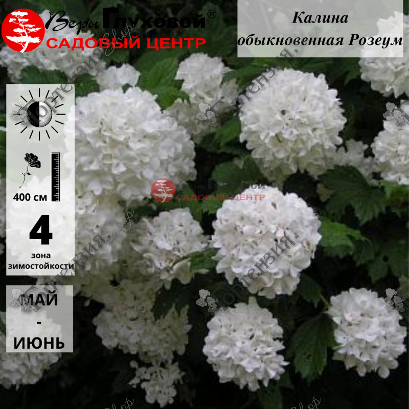 Калина обыкновенная 'Розеум' Viburnum opulus  'Roseum' -листопадный крупный раскидистый кустарник, высота до 7 м диаметр кроны до 4 м. Живет более 50 лет. листья кленовидные зеленые. Цветки белые, мелкие собраны в шаровидные соцветия диаметром до 10 см цветет в июне. К почвам не требовательна. Морозостойкость -34С