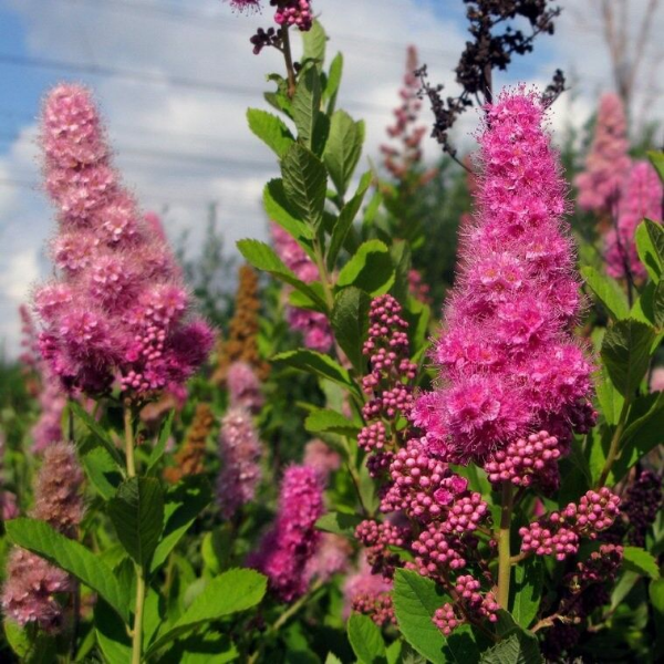 Спирея Билларда Spiraea Billardii  - гибридный сорт спиреи иволистной. Это высокий куст до 2,0 м с длинными, прямыми, раскидистыми ветвями. Молодые побеги тонкие, покрыты листьями по всей длине, растут вертикально.Листья зеленые,к осени становятся буровато-красными. Цветки мелкие, приятного ярко-розового цвета со сладковатым ароматом образуют узкие густые метельчатые соцветия. Цветет со второй половины лета до поздней осени. Светолюбивое, засухоустойчивое выносливое растение. Отличается чрезвычайной зимостойкостью. К почвам не требовательна, растет практически на любых. Не любит застойного увлажнения. Теневынослива, но гораздо лучше цветет на солнечных участках. Растет очень быстро. Укрытия на зиму не требуется.