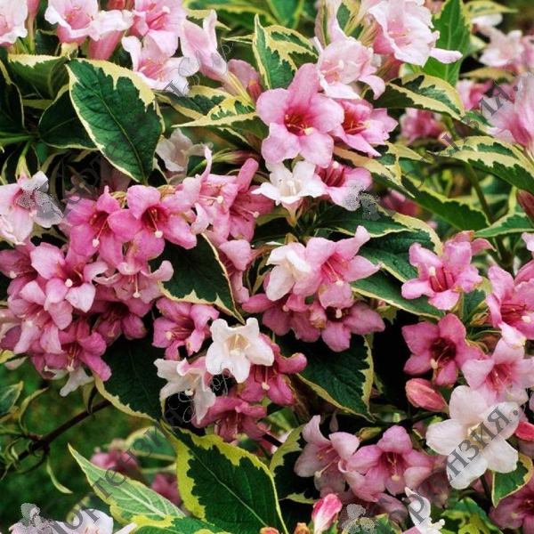 Вейгела цветущая Нана Вариегата (Weigela florida 'Nana Variegata') Кустарник высота 1,5 м, листья золотисто-пёстрые, окаймленные, цветки розовые, цветёт в конце мая-начале июня на прошлогодних побегах. Цветки трубчатые, образованы 5-ю лепестками, напоминают вытянутые колокольчики. Образуют соцветия по 3 – 4 штуки в каждом. Источают приятный аромат. Длина цветка - до 4 сантиметров. Место солнечное или полутенистое. Лучше всего подходят влажные хорошо дренированные и плодородные участки. Молодые побеги красно-бурые, зрелые - коричневые.