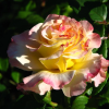Ностальгическая чайно-гибридная роза Aquarell с очень крупными цветками 10-12 см переливающихся розовых и персиково-желтых оттенков. Цветки появляются на длинных прочных побегах, по одному или в небольших кистях. Цветение невероятно обильное. Примечателен также насыщенный фруктовый аромат.