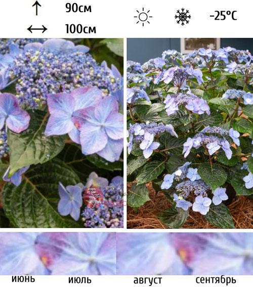 Выносливая и ремонтантная гортензия с сильными ветвями и красивыми туго набитыми цветами ярко-розовыми или сиреневыми, в шаровидных соцветиях. Соцветия-зонтики кружевные, асимметричной формы, диаметром до 20 см. Стерильные цветки полумахровые, розово-красные, в центре кремово-желтые. Соцветия в необычных оттенках от красного до темно-фиолетового цвета появляются на щелочных почвах, в то время как в оттенках синего цвета- на кислых. Цветет все лето, на прошлогодних и новых ветвях. Для поддержания декоративности необходимо удалять отцветшие соцветия. Высота и ширина куста: 80 и 100 см. Растения крепкие и компактные, цветочные шапки очень плотные, крупные. Куст пышный с крупными зелеными листьями высотой до 80 см. Морозостойкость высокая до -25°C. Однако требует укрытия на зиму, чтобы не замерзли почки цветов.